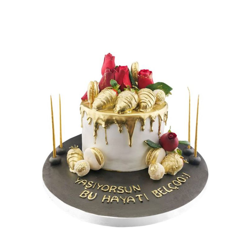 Üzerindeki altın renkli fondan kaplamalar, pastaya zarafet ve lüks bir hava katarak özel bir atmosfer yaratıyor. Şık ve detaylı çiçekler, pastanın güzellik ve zarafetini vurgularken, altın renkli şeker boncuklar ve diğer detaylar da pastayı tamamlıyor. Altın Renkli Çiçekli Butik Pasta, özel günlerde ve kutlamalarda şıklık ve lezzet arayanlar için mükemmel bir seçenektir.