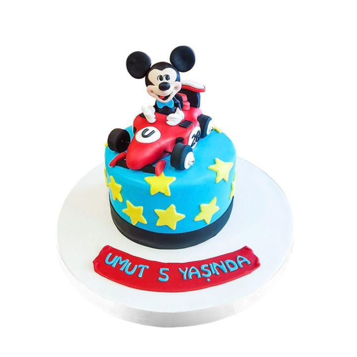 Pastamızın tabanında, özenle hazırlanan lezzetli kekiyle başlıyoruz. Üzerinde yer alan Miki Fare figürü, bu sevimli karakterin arabasıyla birlikte, pastayı adeta bir Mickey Mouse macerasına dönüştürüyor. Renkli şeker hamuru detayları ve arabalı temalı süslemeler, pastayı daha da eğlenceli kılıyor.