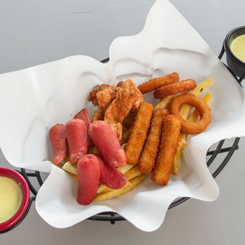 Sigara böreği, tavuk parçaları, nacho cips, soğan halkası, sosis, mozzarella stick, patates kızartması, iki adet sos ile