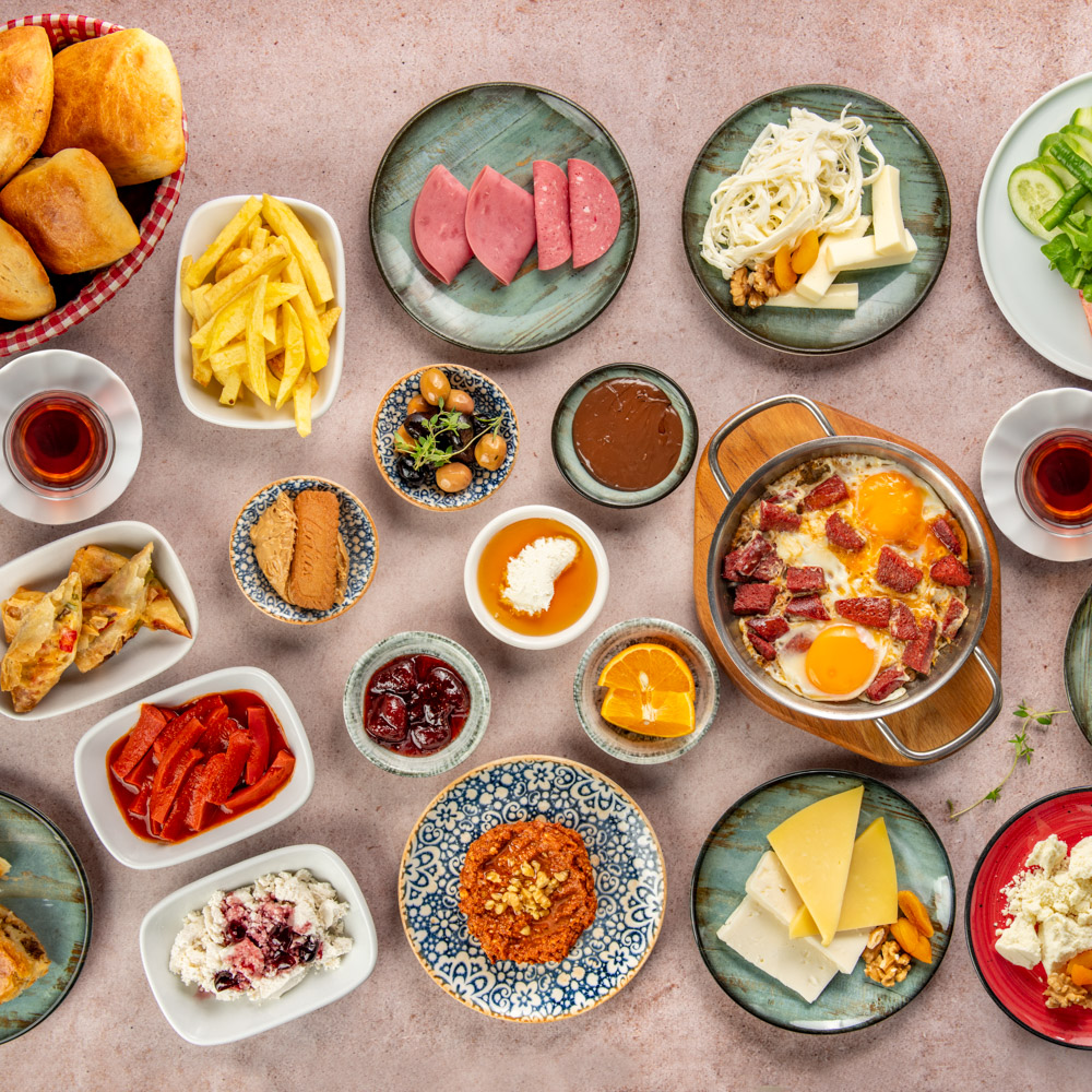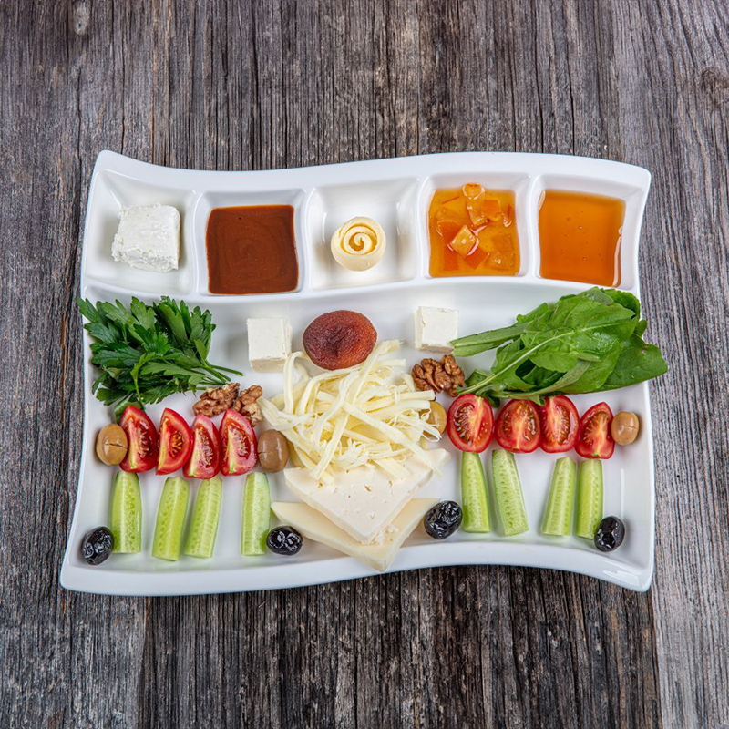 Ezine peyniri, dil peyniri, çeçil peyniri, eski kaşar, misket mozzarella, tereyağı, taze kaşar, Erzincan tulum peyniri, dana jambon, salam, kahvaltılık sos, sahanda sucuk, sahanda yumurta, börek tabağı, domates, salatalık, köy biberi, roka, vişne reçeli, yeşil ve siyah zeytin, Nutella, bal kaymak, lotus, patates kızartması, iki dilim portakal.