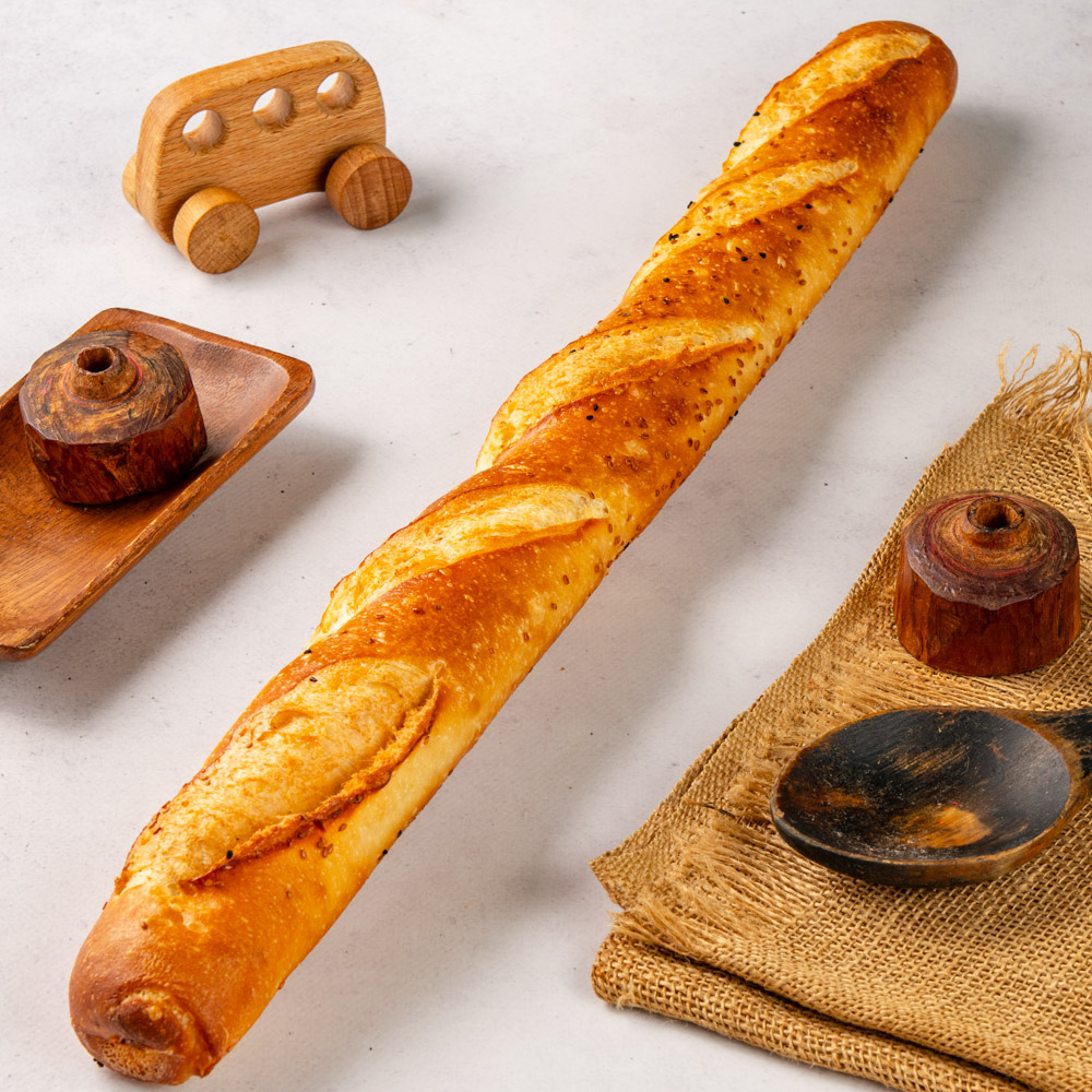 Baget ekmek AUM Pastanesi'nde! Fransız usulü çıtır kabuklu baget. Uzun fermentasyon, el yapımı. Sandviç ve yemek yanı için ideal.