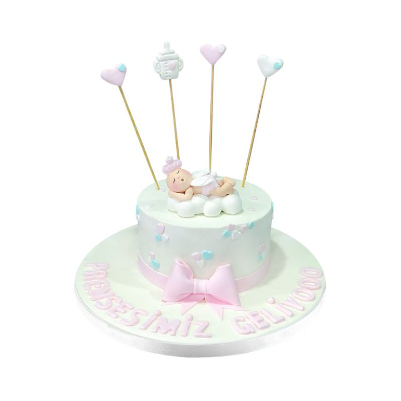 Pastanın üstünde yer alan bebek beşiği, ayakkabıları veya bebek giysileri gibi detaylar, beklenen minik misafiri temsil ediyor. Bebek mavisi veya bebek pembe renkler, pastaya hoş bir yumuşaklık katarken, sevimli figürler ve detaylar pasta üzerinde özel bir atmosfer yaratıyor.