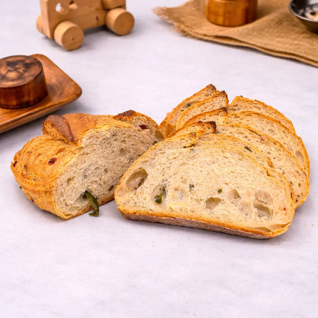 Biberli ekmek AUM'da! Kırmızı biber parçalı baharatlı ekmek. Hafif acılı lezzet, renkli görünüm. Kahvaltı ve atıştırmalık için ideal seçim.