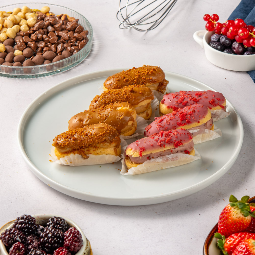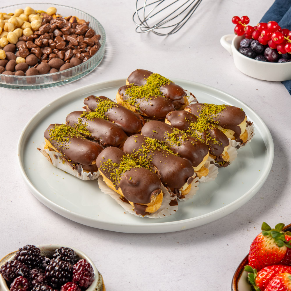 Çikolatalı eklerlerimiz, geleneksel Fransız pastacılığının en sevilen tatlarından biridir. Hafif ve havadar hamur içinde çikolatalı krema dolgumuz ve üzerinde çikolata sosu ile sunulan bu mini tatlılar, çikolata severlerin favorisidir. Günlük taze üretimimizle, her zaman en taze halini deneyimleyebilirsiniz.