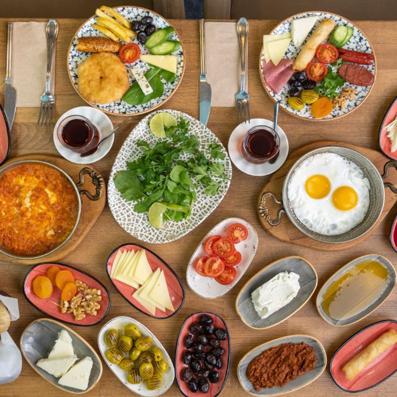 Ezine peynir, İzmir tulum peynir, domates, salatalık, haşlanmış köy yumurtası, avokado, köy biberi, roka, tahin, pekmez, zeytin, baharatlı zeytinyağı, ceviz, kayısı
