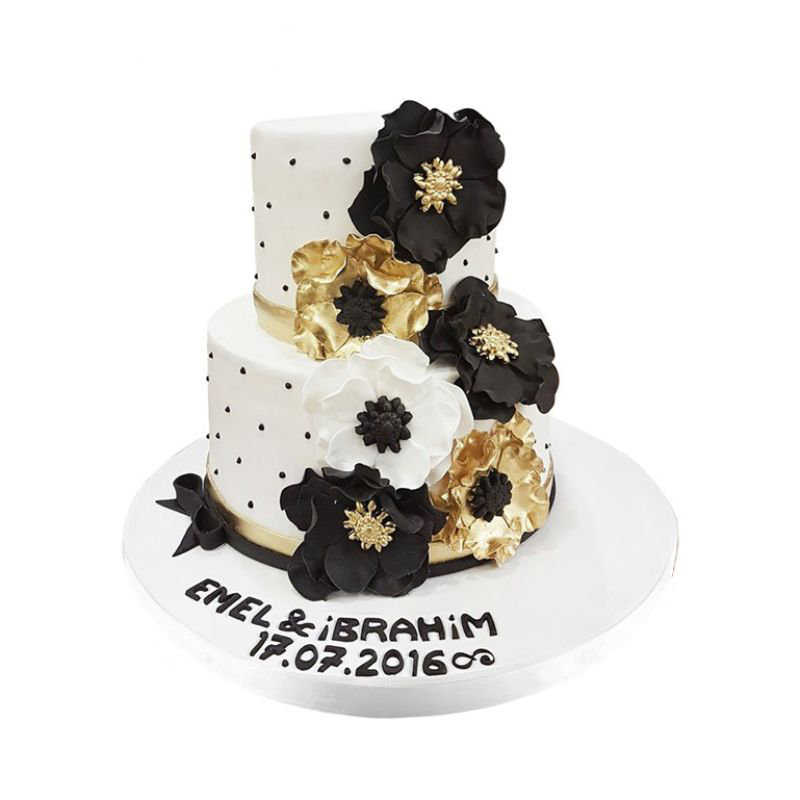 Pastanın çiçek motifleri, romantizmi temsil eder. Altın rengindeki çiçekler, aşk dolu bir birlikteliği ve nişanı ifade eder, pastaya romantik bir hava katar.