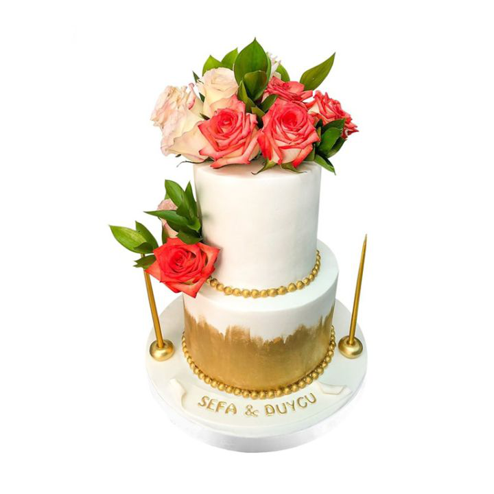 Özel bir nişan töreni için tasarlanmış, lüks ve zarafet dolu bir pasta: Gold Güllü Nişan Pastası! Bu özel pasta, altın renkli güller, şık tasarımı ve lezzetli dokusu ile nişan kutlamalarınıza ihtişam katıyor.