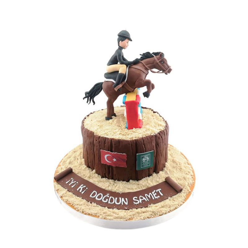Pastanın üstünde, yarış heyecanını canlandıran detaylarla süslenmiş bir jokey figürü yer alıyor. Jokeyin at üzerindeki duruşu ve yarış pistinin atmosferini yansıtan renkli şeker hamurları, pastanızı bir sanat eserine dönüştürüyor. Yarışın nabzını hisseden bu figür, doğum günü çocuğunuzun veya at yarışı tutkunu sevdiklerinizin yüzünde büyük bir gülümseme yaratıyor.
