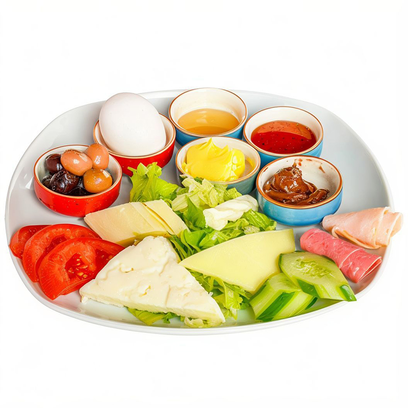 Ezine peynir, taze kaşar, misket mozzarella, salam, sahanda yumurta, domates, salatalık, siyah zeytin, yeşil zeytin, vişne reçeli