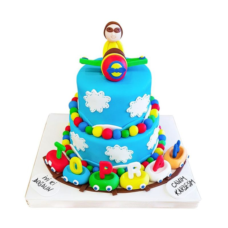 Pastanın üstünde renkli fondan kaplamalar ile tasarlanmış uçaklar, pastayı adeta bir havalimanına dönüştürüyor. Bulut detayları, pastanın etrafında uçuşan neşeli uçakları güzel bir şekilde tamamlıyor. Eğer isterseniz, pasta üzerinde pilot şapkası veya kişiselleştirilmiş doğum günü mesajları da ekleyebilirsiniz.