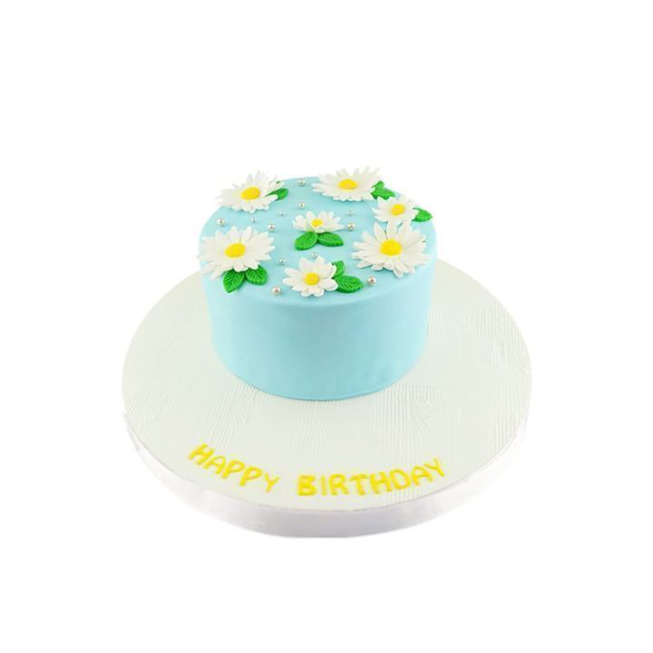 Pastanın kenarları, yumuşak renklerle kaplanmış ve şeker hamuru detayları ile süslenmiştir. Minyatür şeker hamuru papatya figürleri, pastaya zarafet ve hafiflik katarak, doğanın güzelliklerini temsil eder. Yeşil şeker hamuru yapraklar, pastaya organik bir atmosfer kazandırır.