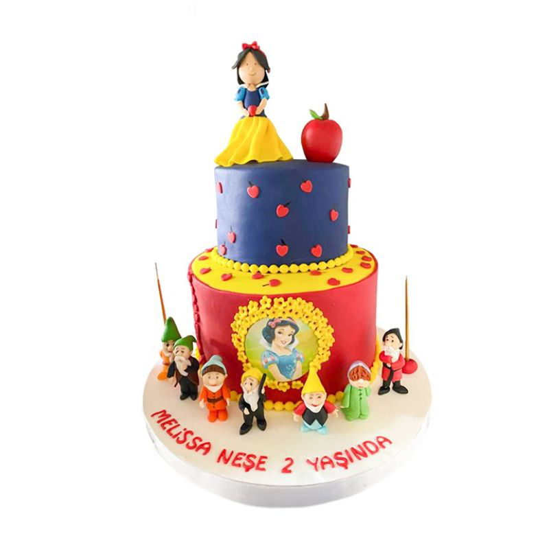 Pastanın üst yüzeyinde, şeker hamuru ile özenle tasarlanmış Prenses figürü ve Cüceler sizi karşılar. Renkli şeker hamuru detayları, pastaya masalsı bir atmosfer katmaya hazır. Prenses'in zarafeti ve Cüceler'in neşesi, pastanın zirvesinde unutulmaz bir hikaye anlatır.
