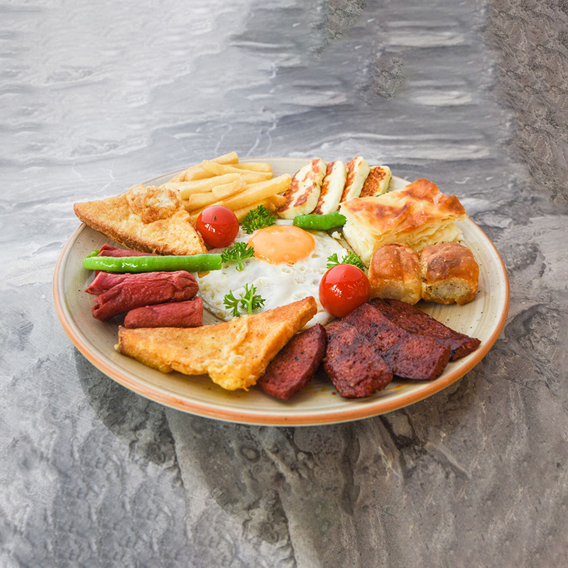 Su böreği, kıymalı börek, yumurtalı ekmek, ızgara hellim peyniri, kızarmış sucuk ve sosis, kızarmış patates, göz yumurta