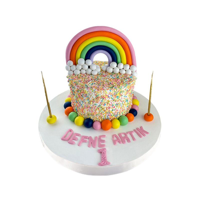 Pastanın üstünde detaylı olarak tasarlanmış gökkuşağı, şekerleme figürleri ve kişiselleştirilebilir öğeler bulunuyor. Renk seçenekleri ve 1 yaş doğum günü temasına özel detaylarla kişiselleştirilebilen bu pasta, sevimli bir gökkuşağı temalı kutlama atmosferi yaratır.